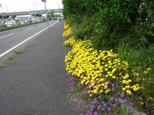 郵便局横の歩道は、ガザニアが満開